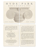 We are excited to offer this exclusive poker deck that we recently completed for the New York-based company, Hyde Park Mouldings, one of the world's premier architectural molding companies. Working closely with the owner, David Nassim, we were able to bring the artwork of his skilled craftsman, Vincent Kallenbaum, together with our playing card design sensibility to create one unique and handsome deck.