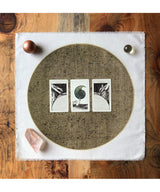 Long inspired by the Indian minimalist, tantric paintings of the early 20th century that created exactly this space in the mind's eye, we chose to follow this path for our design direction. Our tarot cloth has been hand-pulled at the studio using water-based inks that we hand-mix with the powerful mineral Mica. Artists and healers have long used minerals for their natural earth tones and, just as importantly, for their spiritual properties.